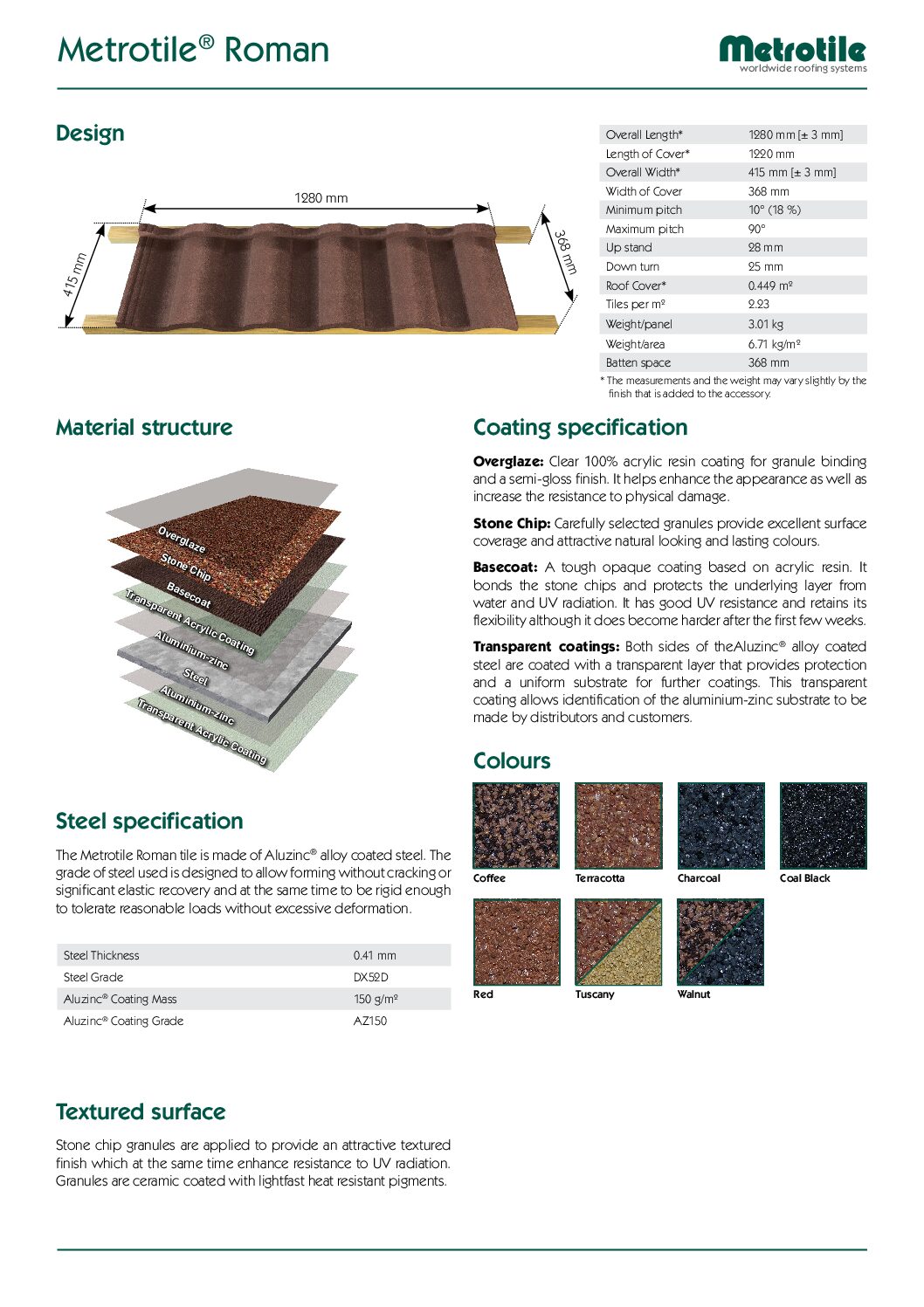 METROTILE Roman metāla dakstiņi jeb kompozītdakstiņi ir romānikas stila profila metāla moduļu jumta segums ar dabīgās akmens smalces pārklājumu, kas apvieno izcilu izturību, estētiku un videi draudzīgu risinājumu. Šo kompozītdakstiņu pusapaļā forma piešķir jumtam eleganci un rada ēkas stabilitātes un varenuma sajūtu. Roman atgādina tradicionālā dabiskā māla jumta seguma izskatu, kas vēsturiski ļoti bieži tika izmantots Vidusjūras zemēs. Tā īpatnējā forma un spilgti izteiktais profils izceļ Roman starp citiem akmens smalces pārklājuma kompozītdakstiņiem.