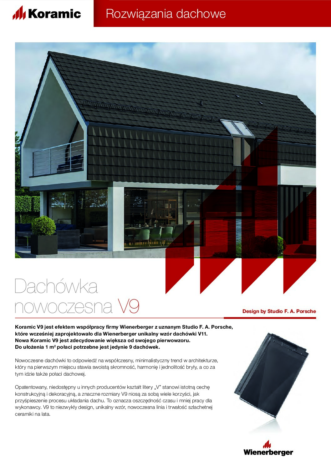 Koramic V9 māla dakstiņi ir rezultāts sadarbībai starp WIENERBERGER un prestižo Studio F.A. Porsche. Patentētais, īpaši asais “V” profils rada dinamisku un arhitektoniski izteiksmīgu jumta vai fasādes apdari, savukārt trijstūrveida šķērsgriezums piešķir grafisku un elegantu raksturu, kas lieliski sader ar mūsdienu arhitektūru un ēkām ar skaidrām, tīrām līnijām.