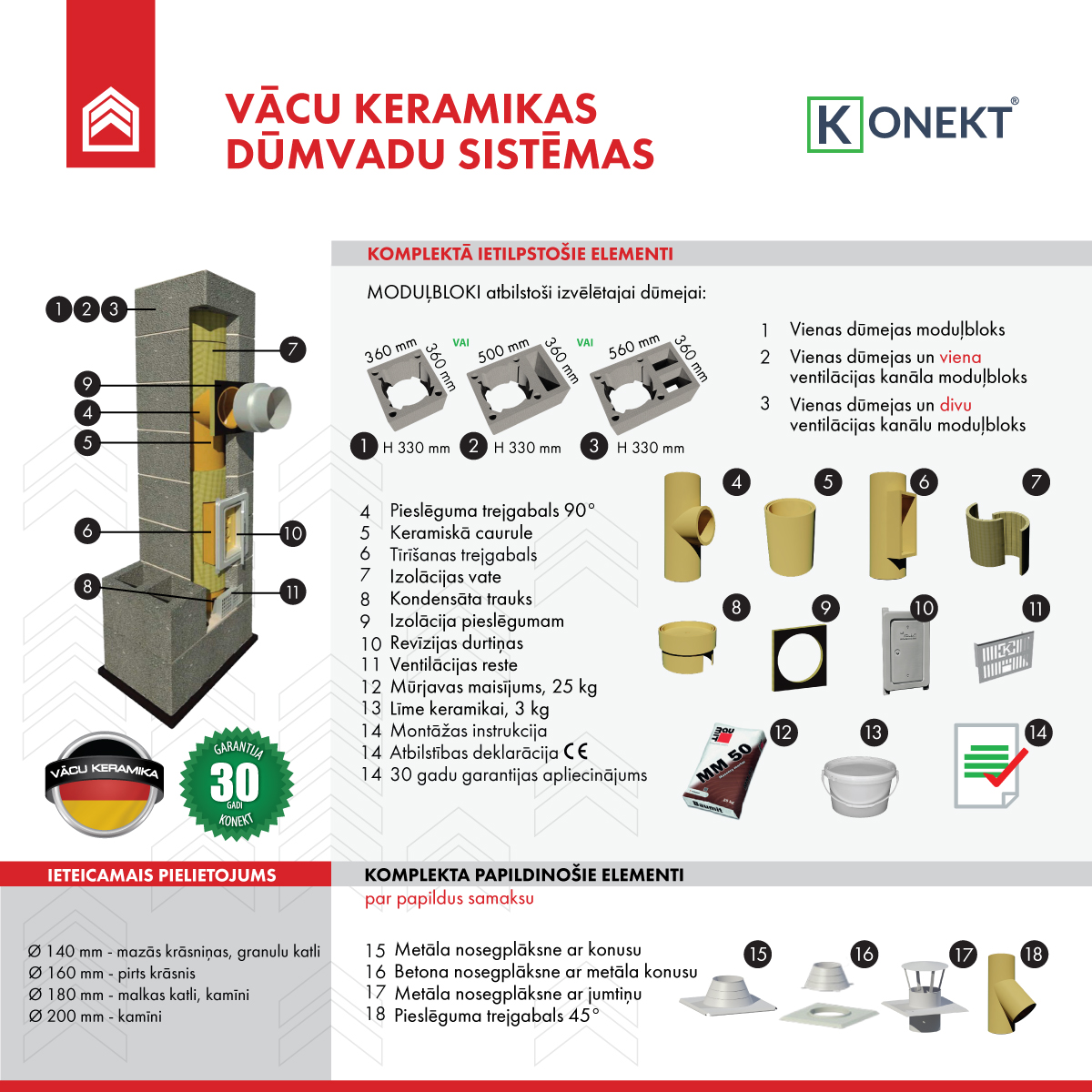 Dūmvadi KONEKT – mūsdienīgas vācu keramikas dūmvadu sistēmas. Šie dūmvadi ir piemēroti visiem apkures katliem ar slēgtu degšanas kameru un kondensācijas katliem. Tajos var izmantot dažāda veida kurināmo: malku, ogles, gāzi, granulas u.c. Dūmvadi pieejami pilnā komplektācijā ar ventilāciju vai bez tās, dažādos diametros.
